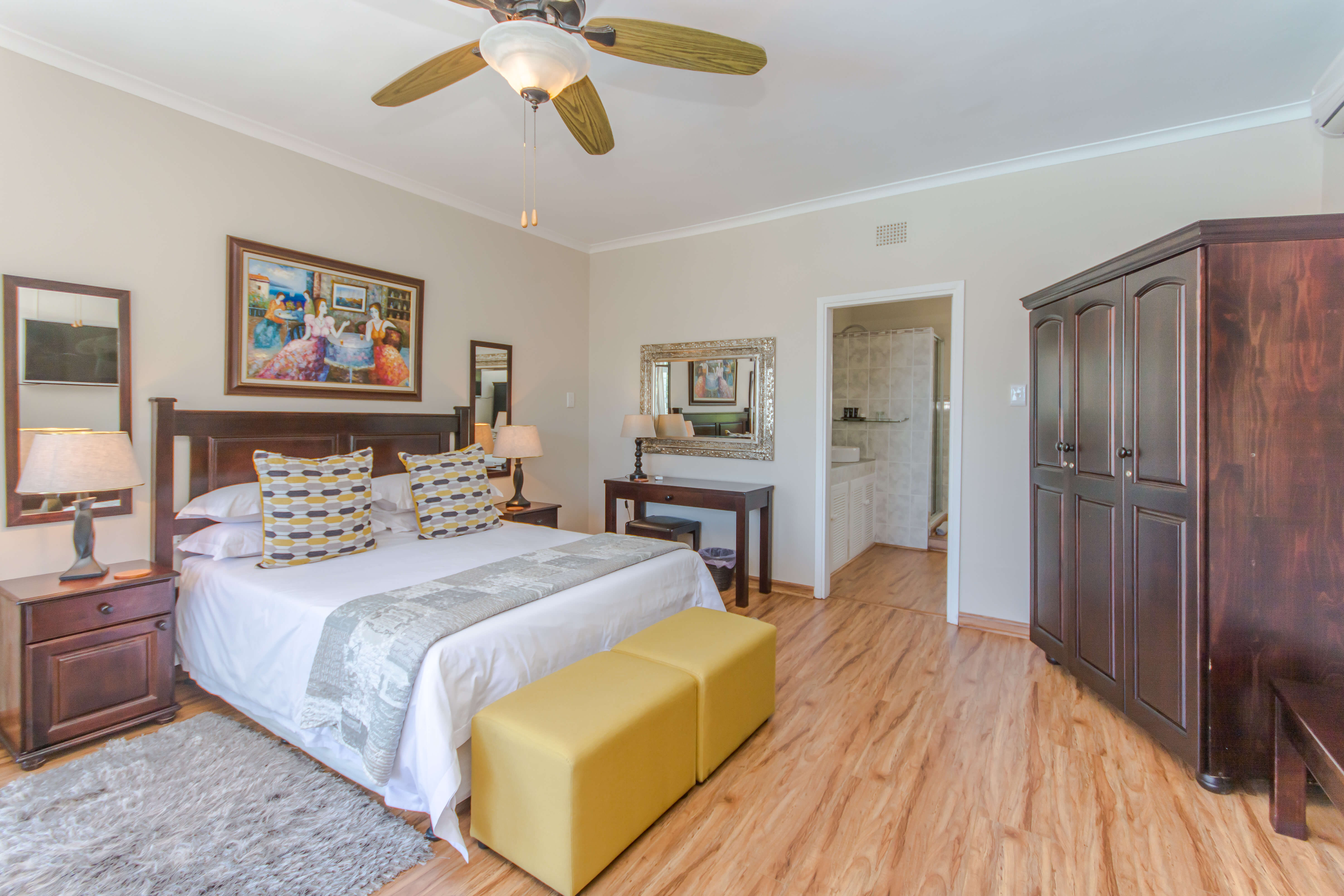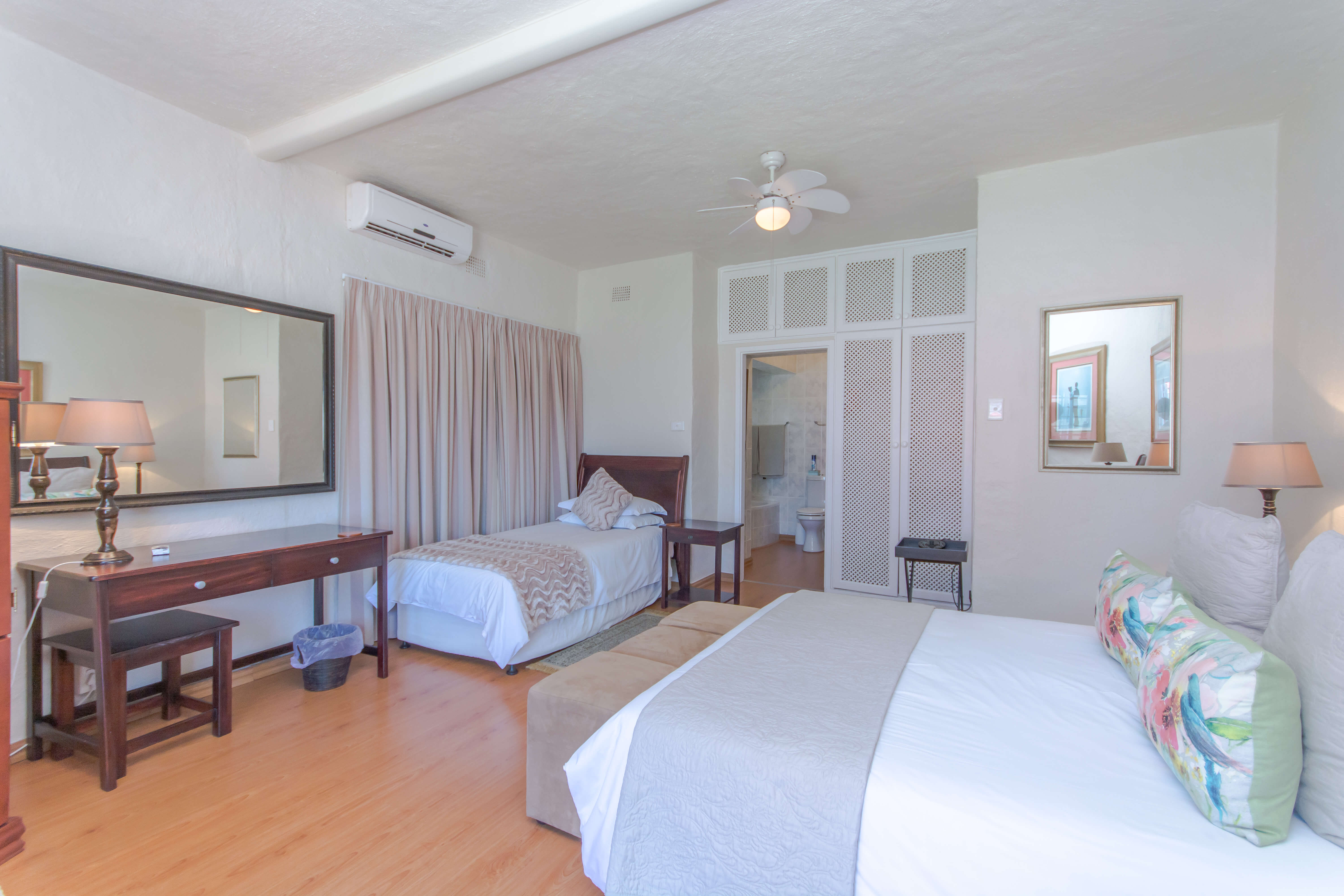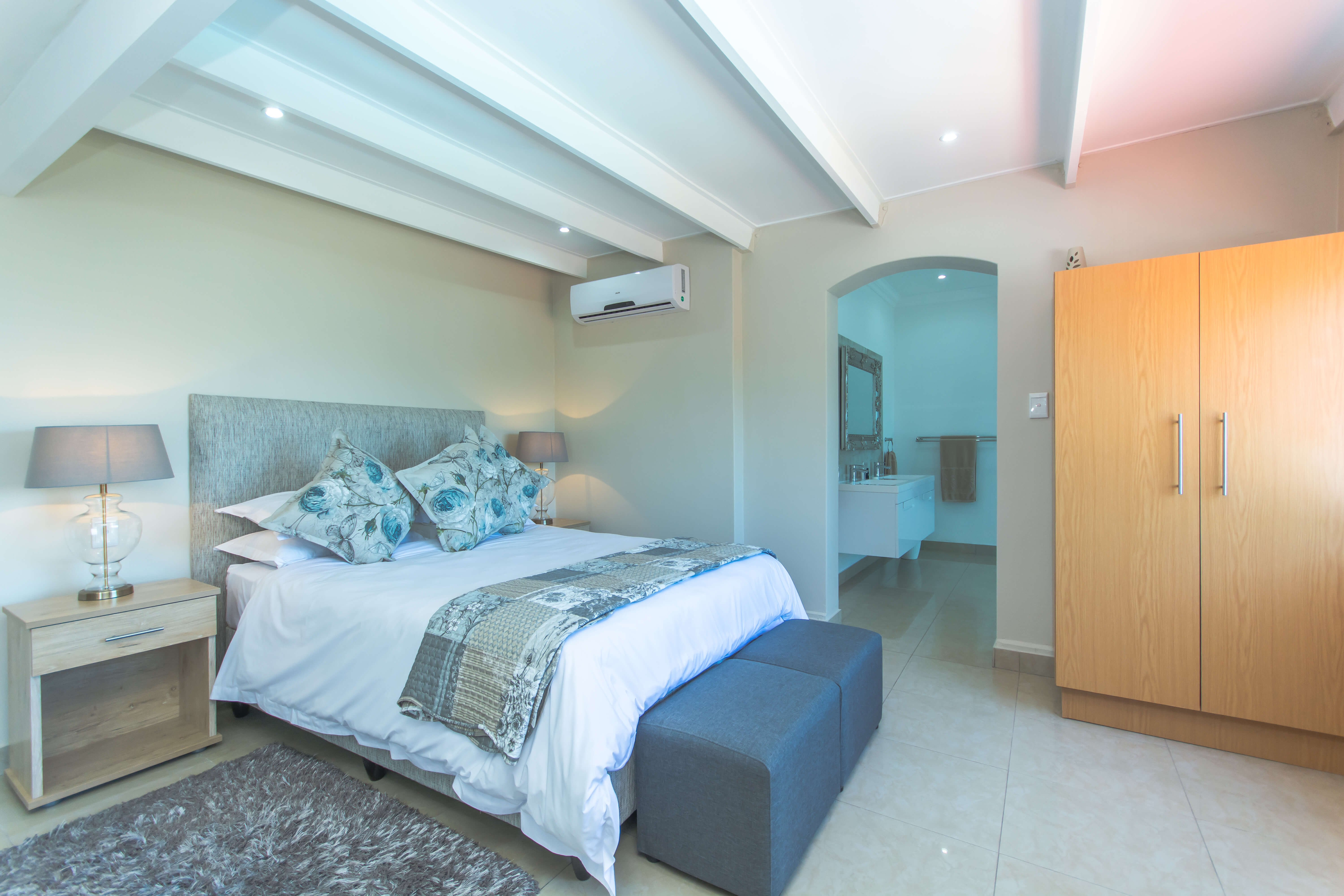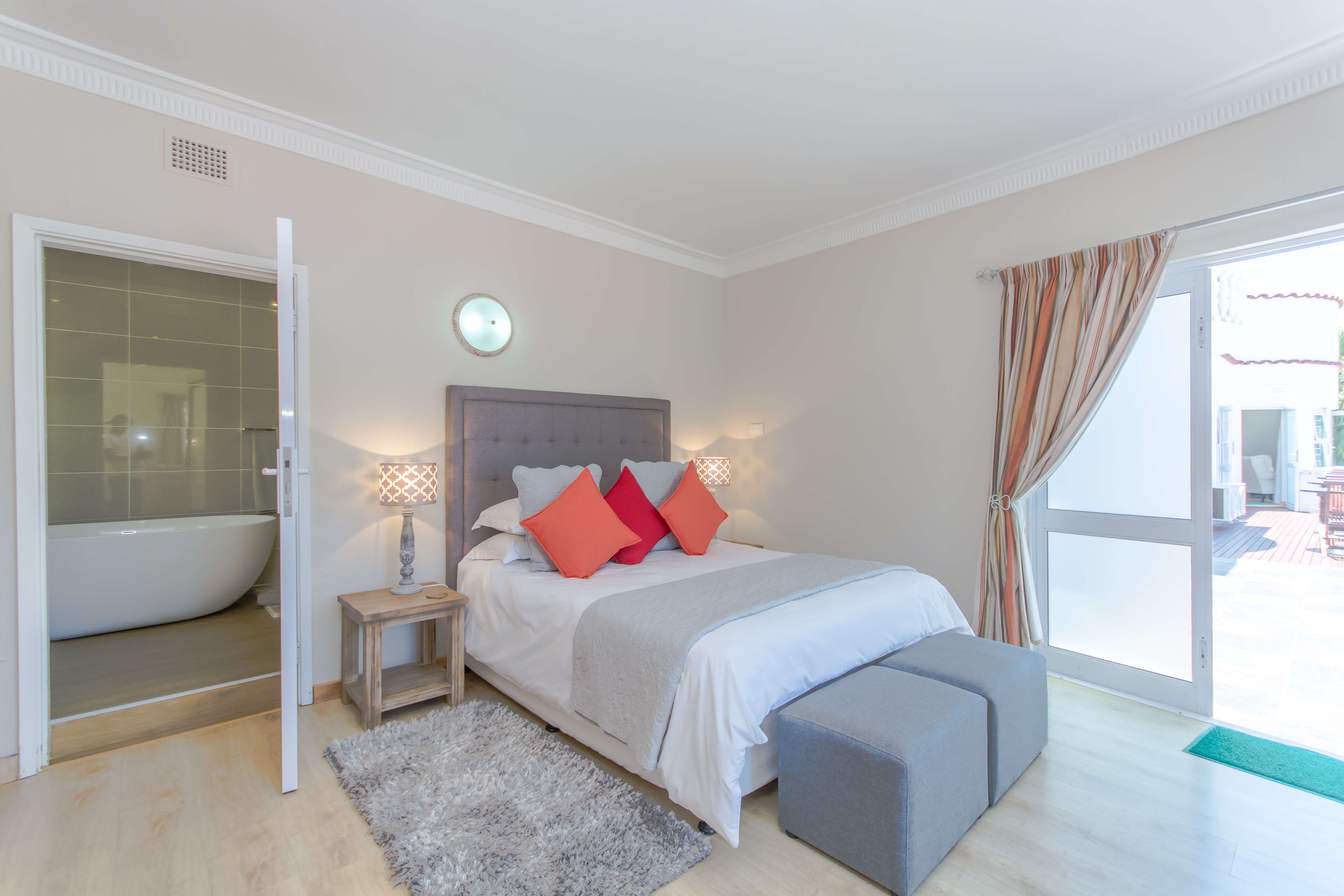 This bright and airy luxury room consists of a Queen size bed and features an en-suite bathroom with double basins, shower and bathtub.