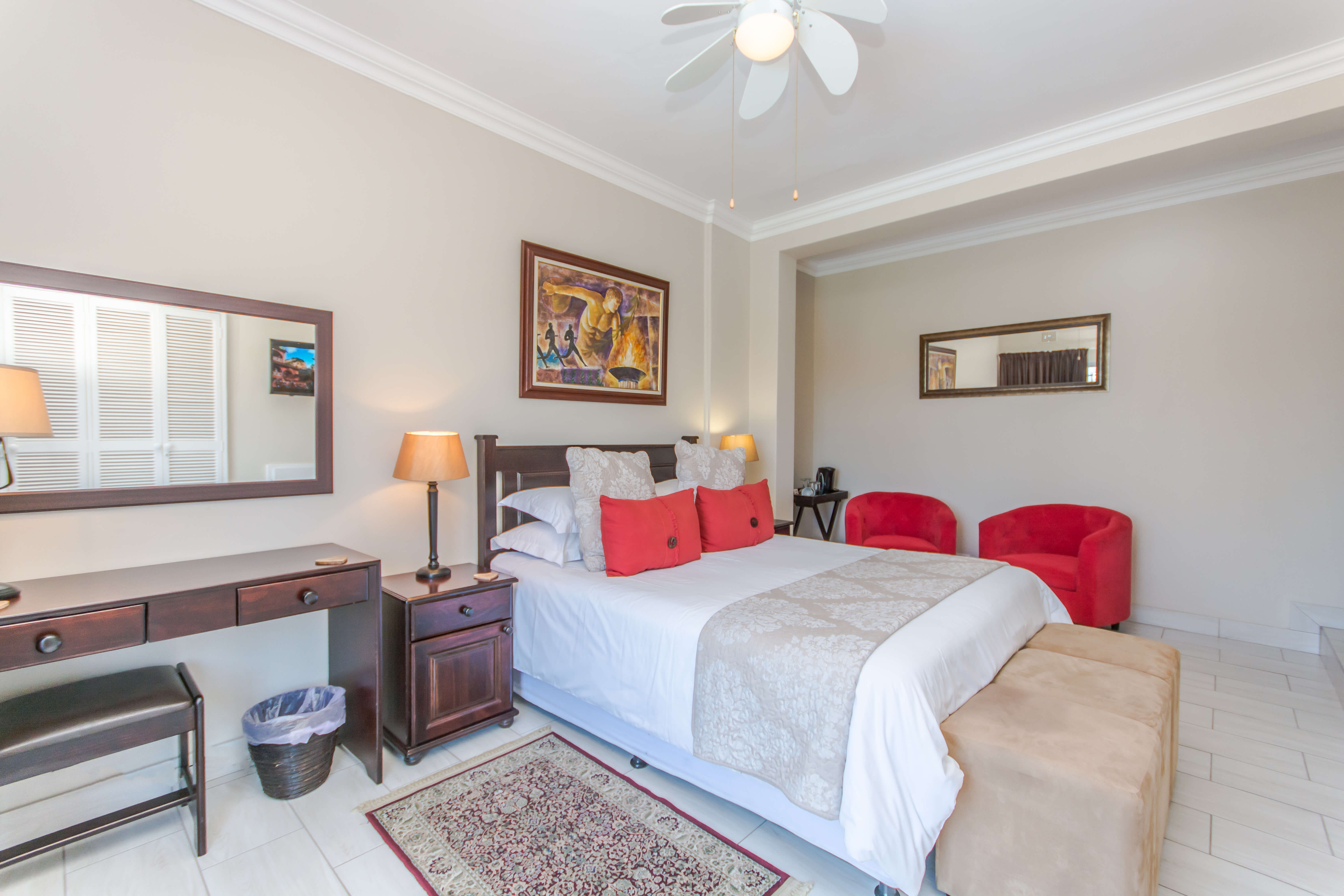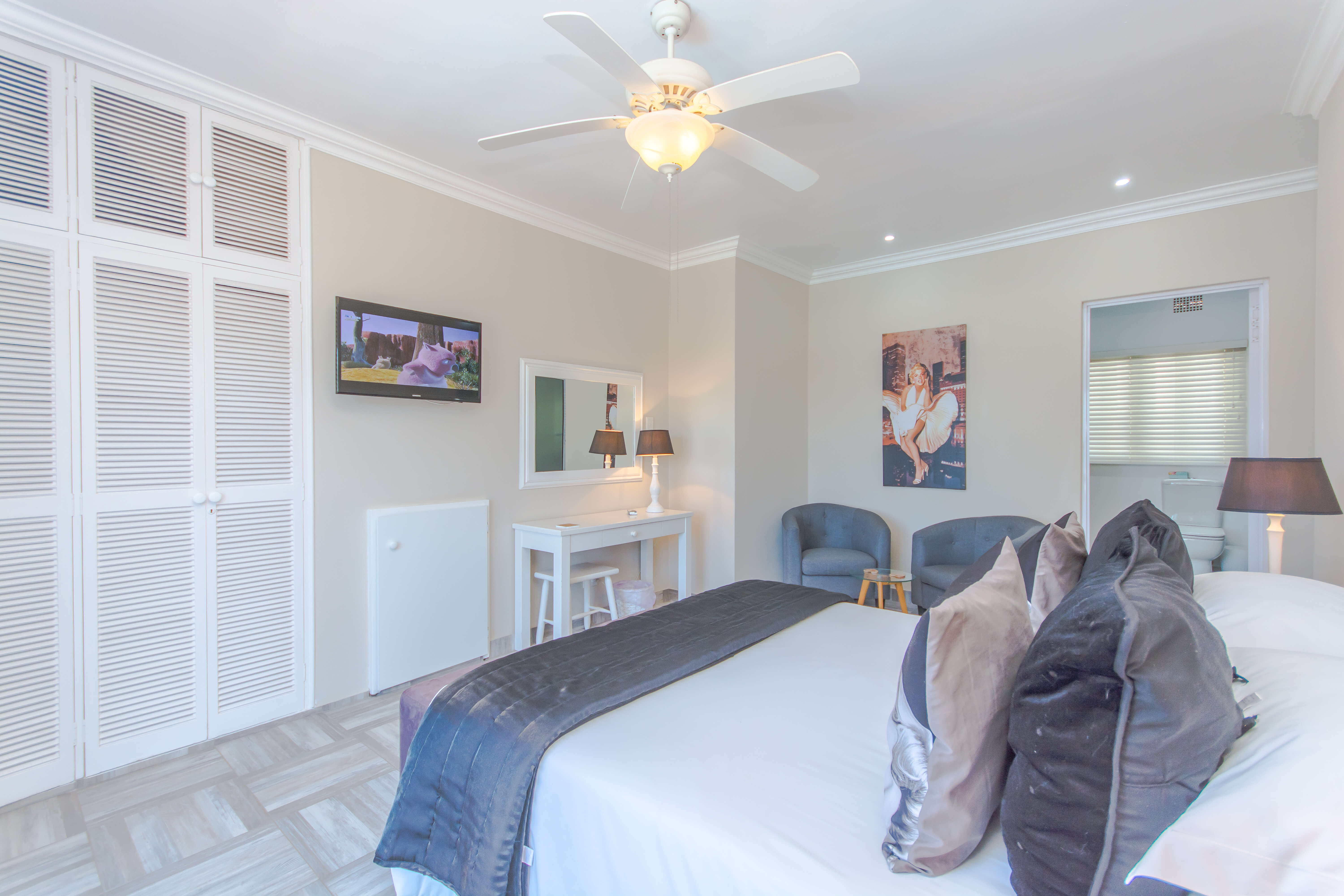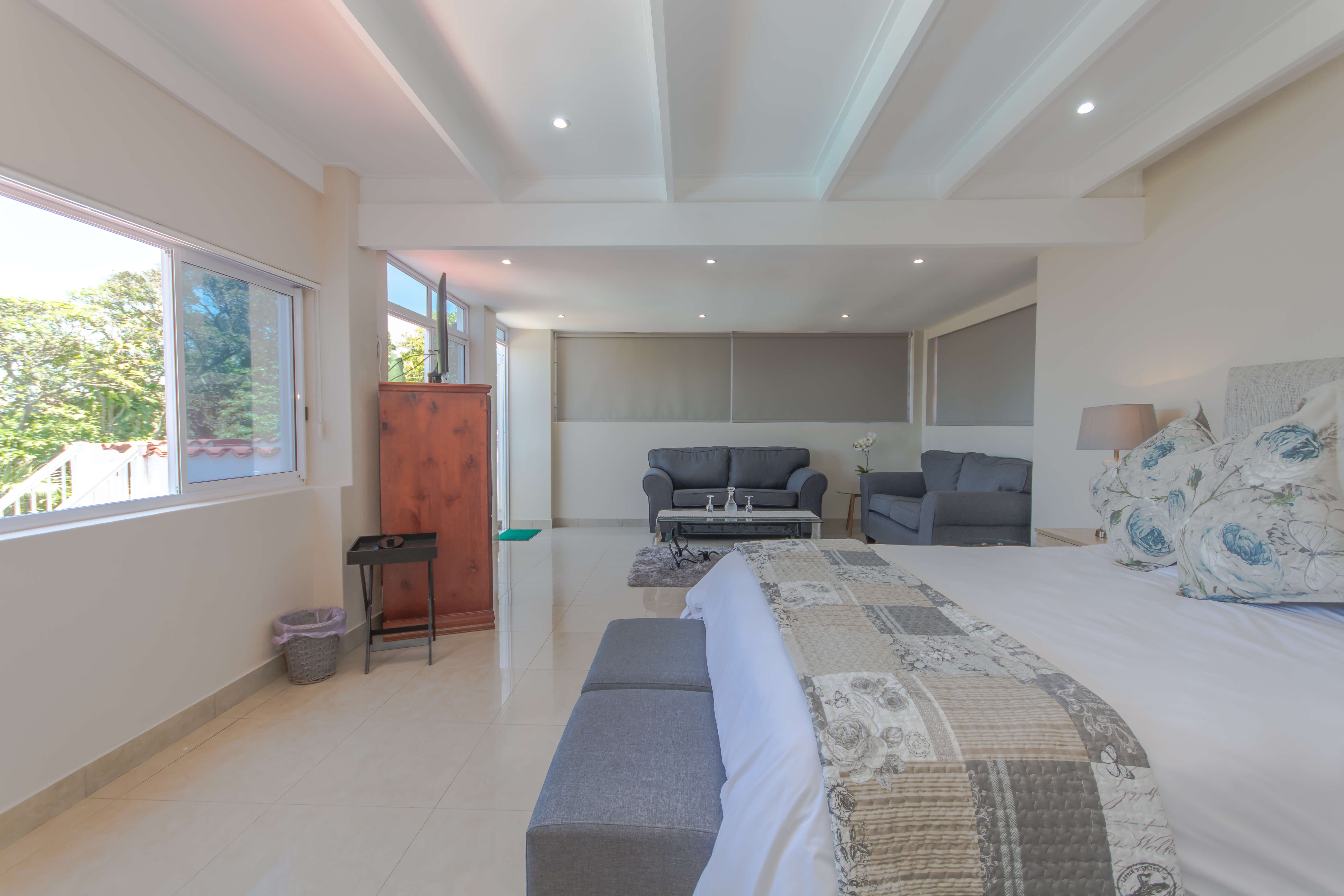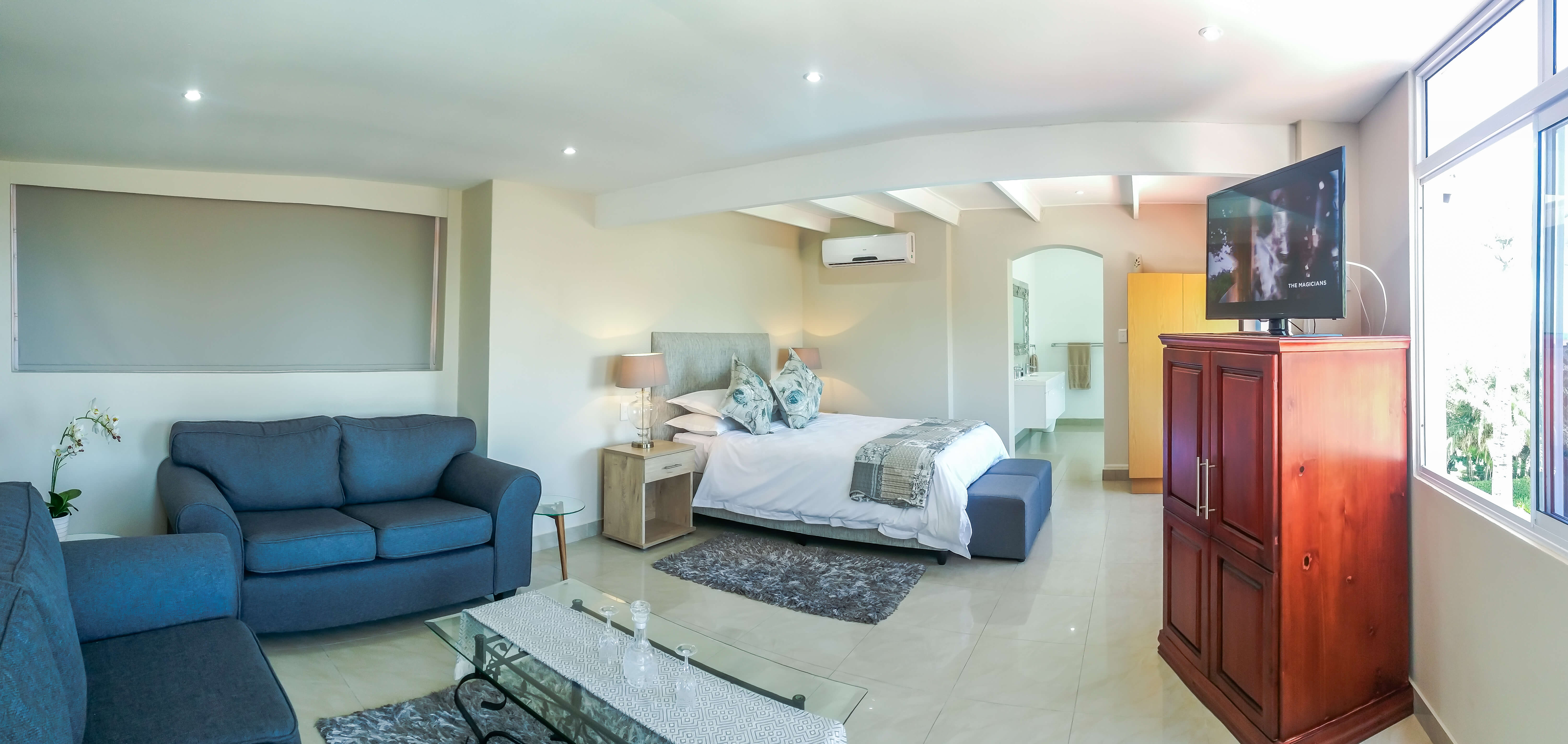 This bright and airy luxury room consists of a Queen size bed and features an en-suite bathroom with double basins, shower and bathtub.