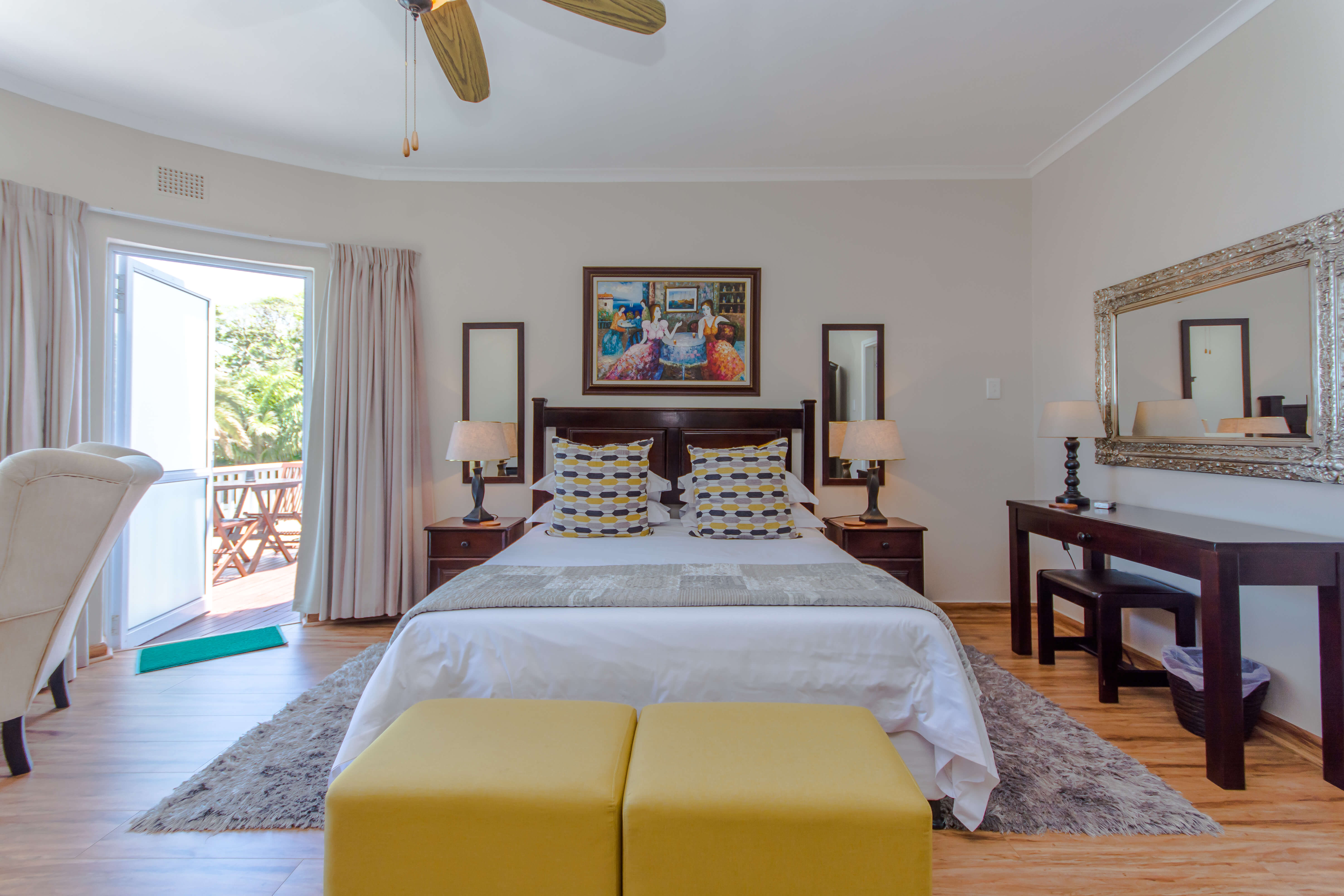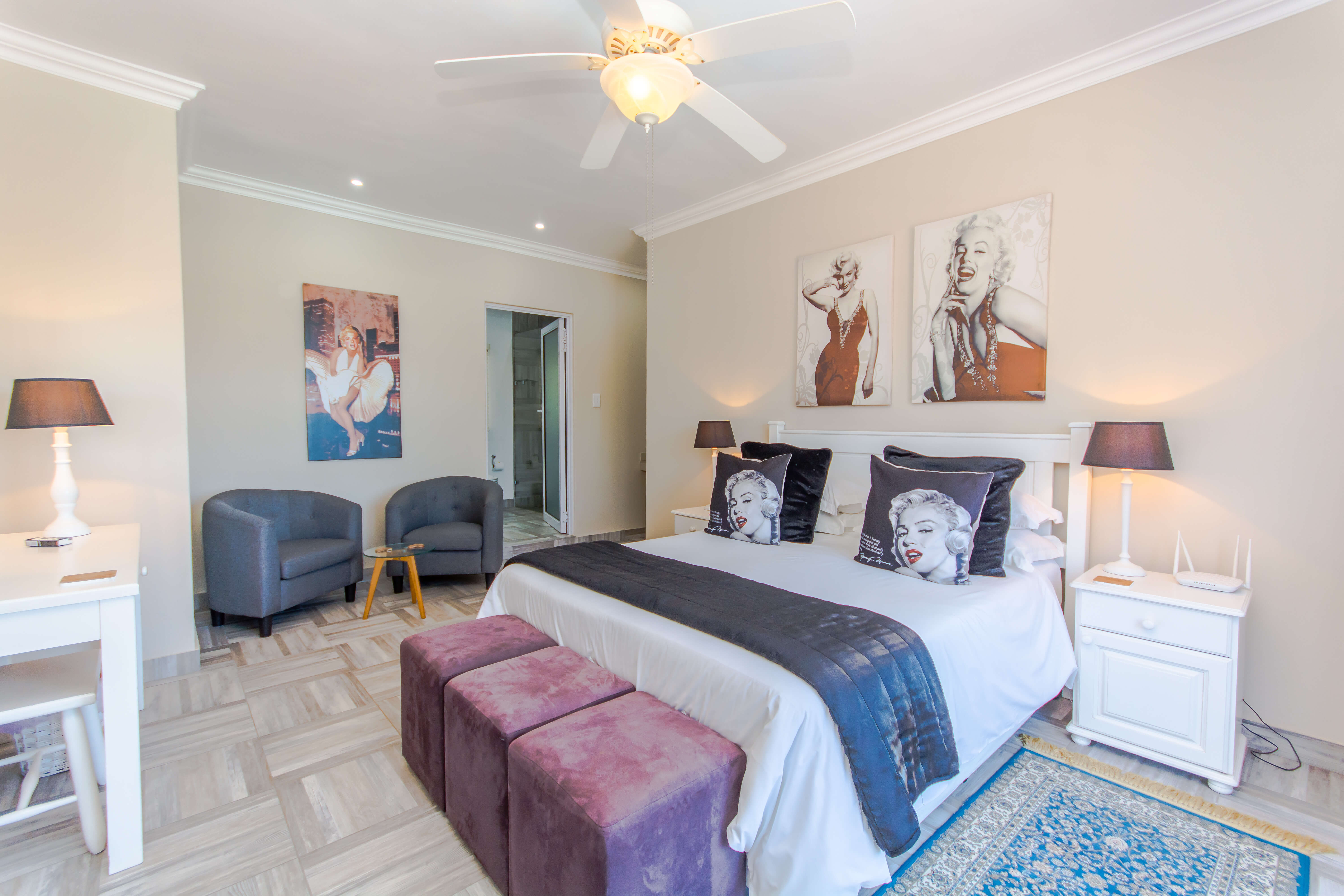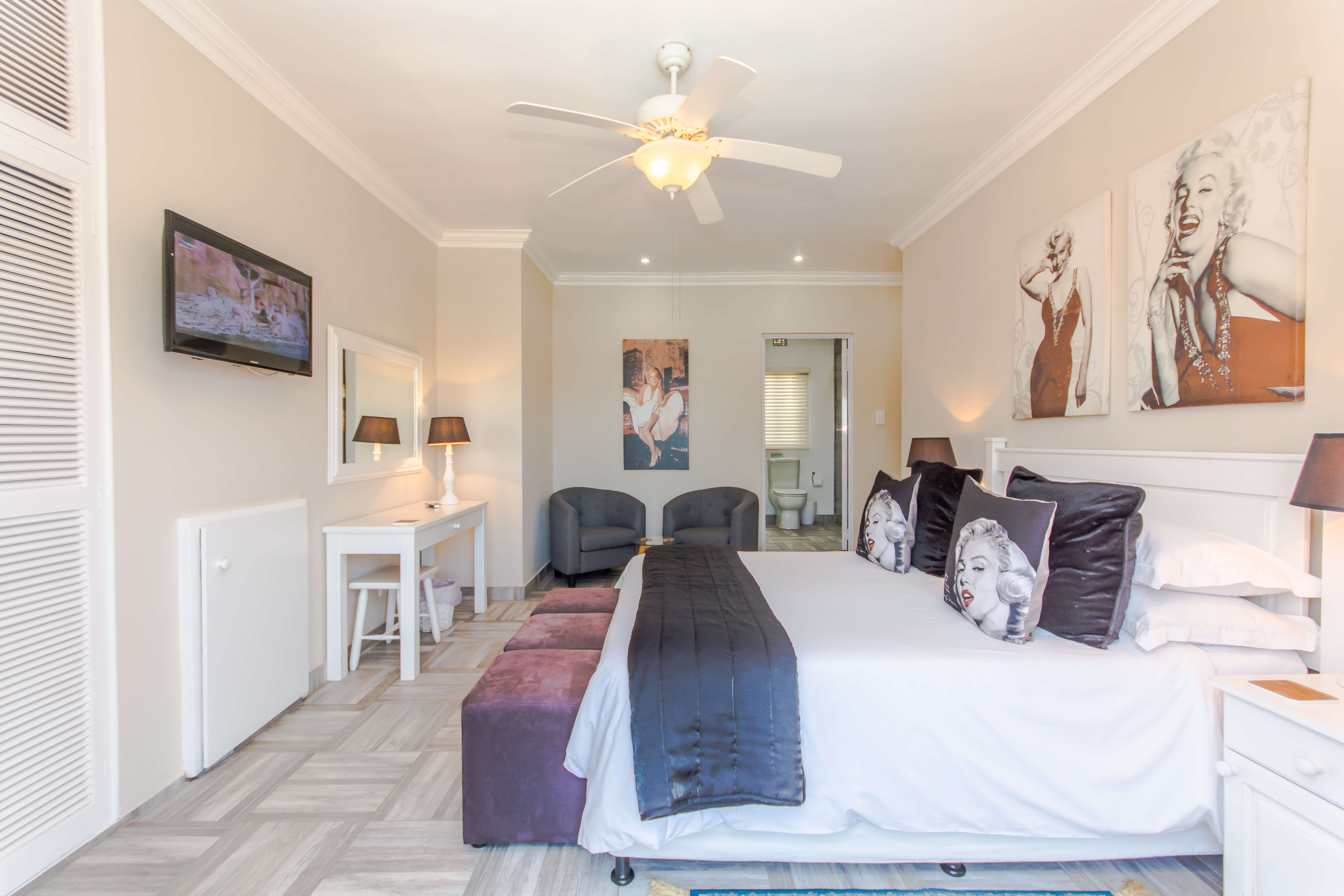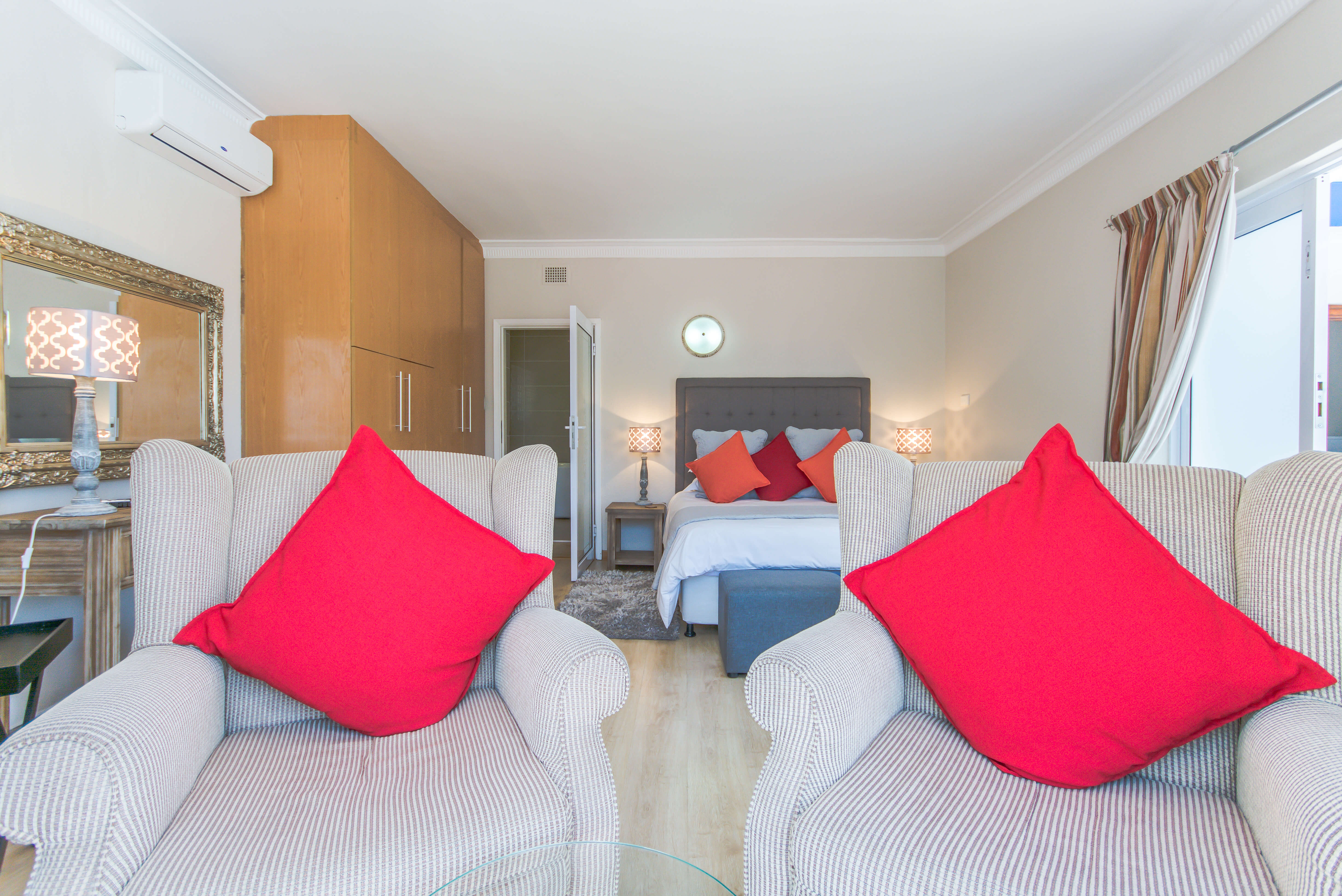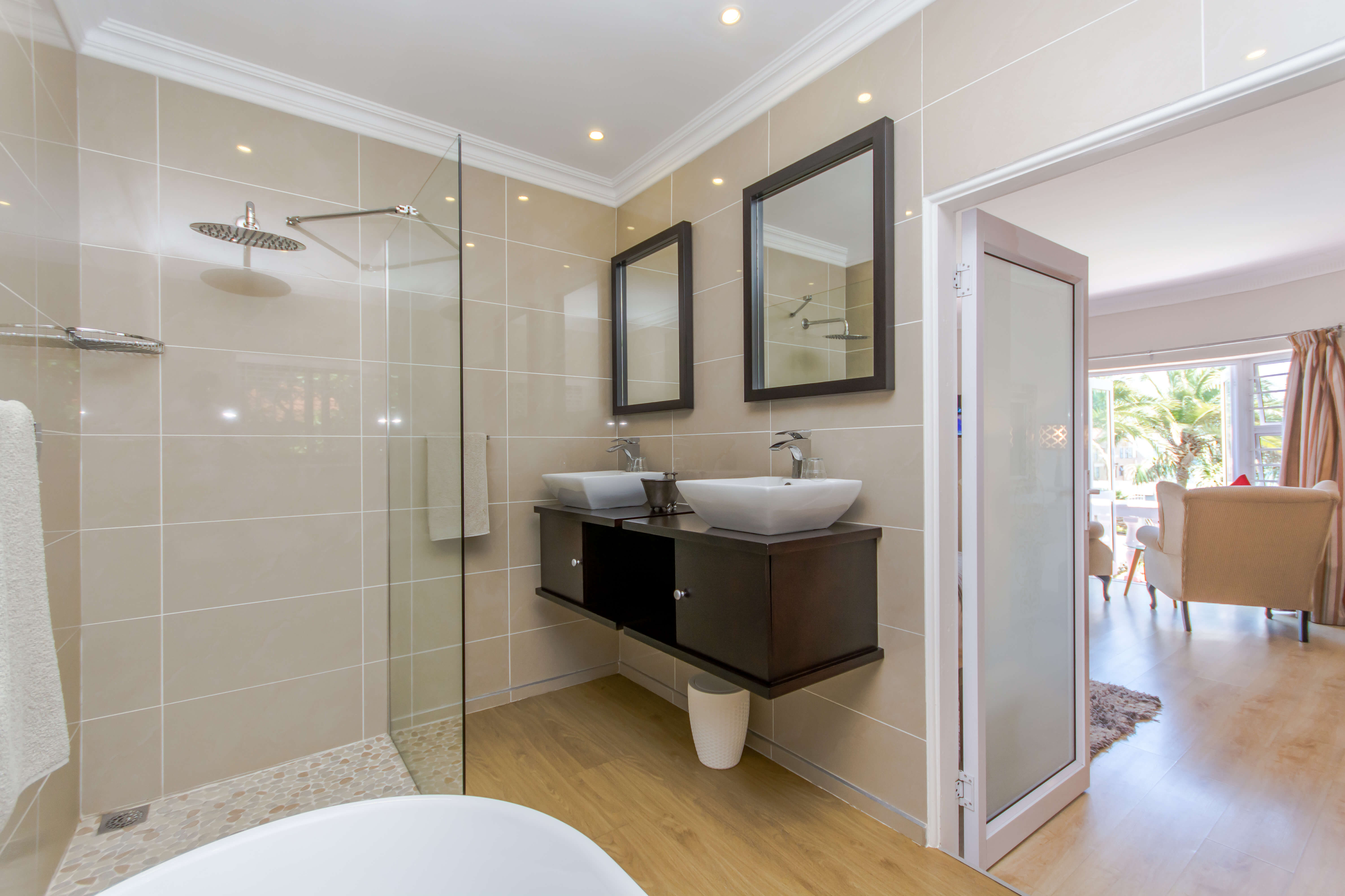This bright and airy luxury room consists of a Queen size bed and features an en-suite bathroom with double basins, shower and bathtub.