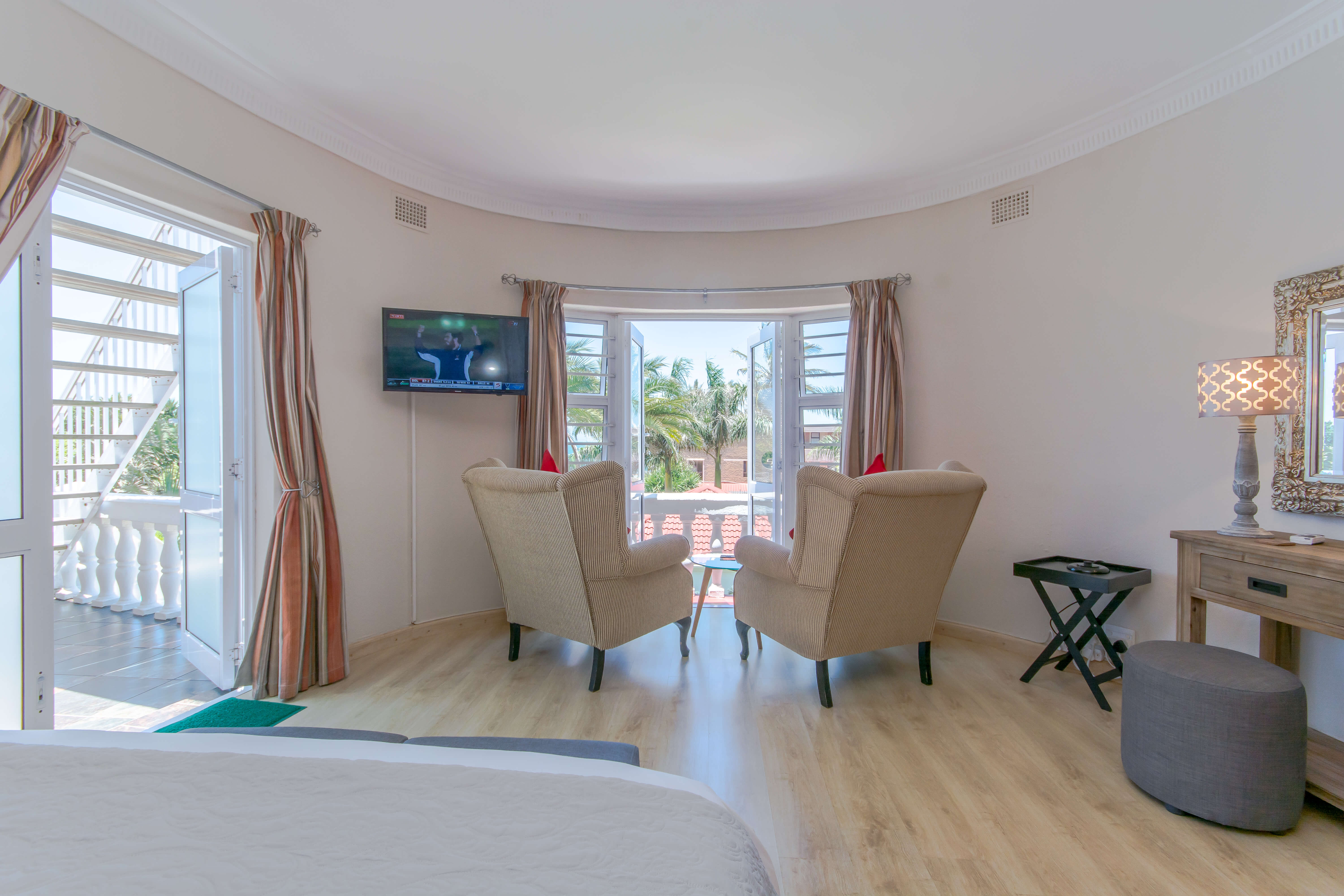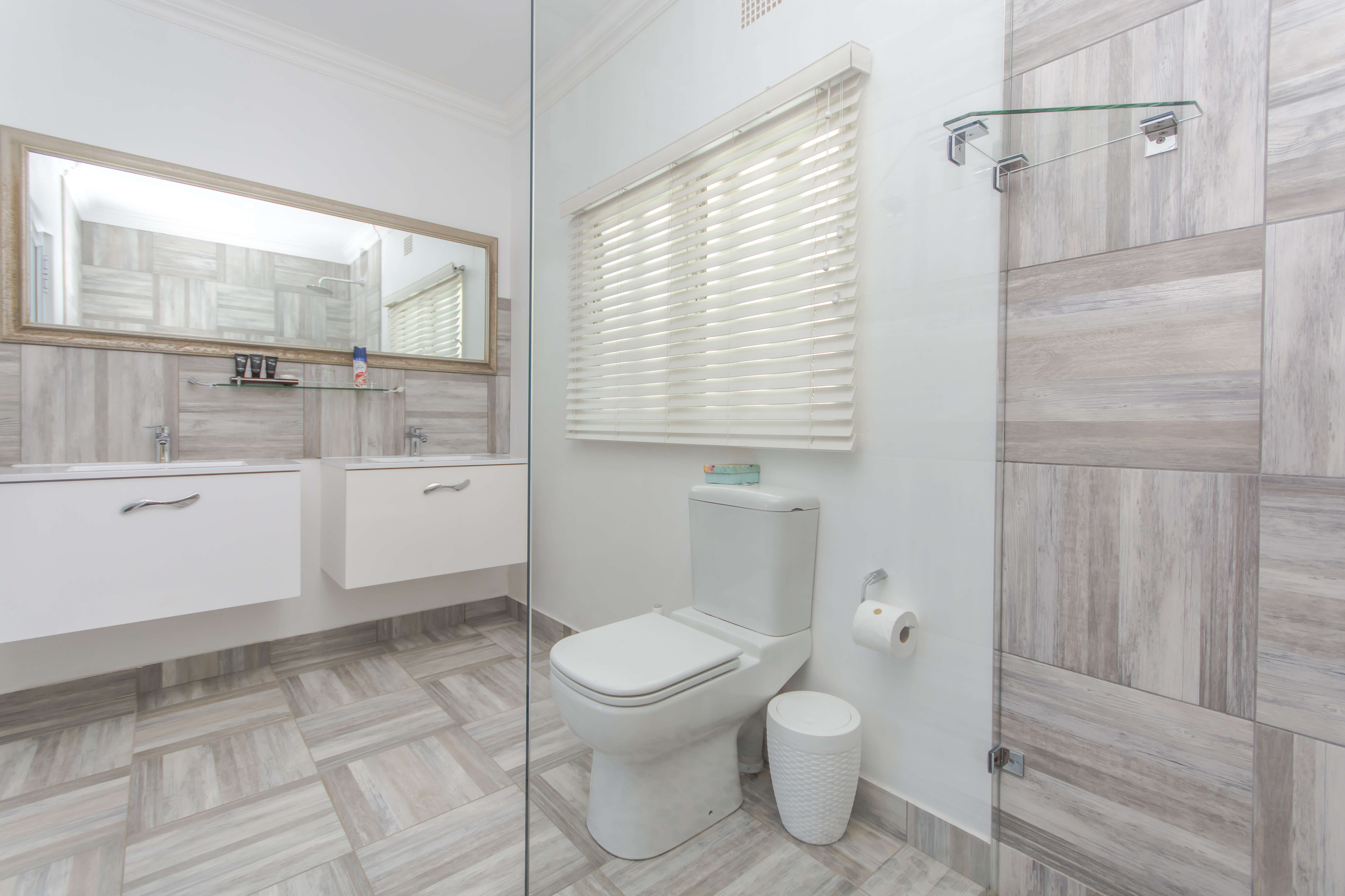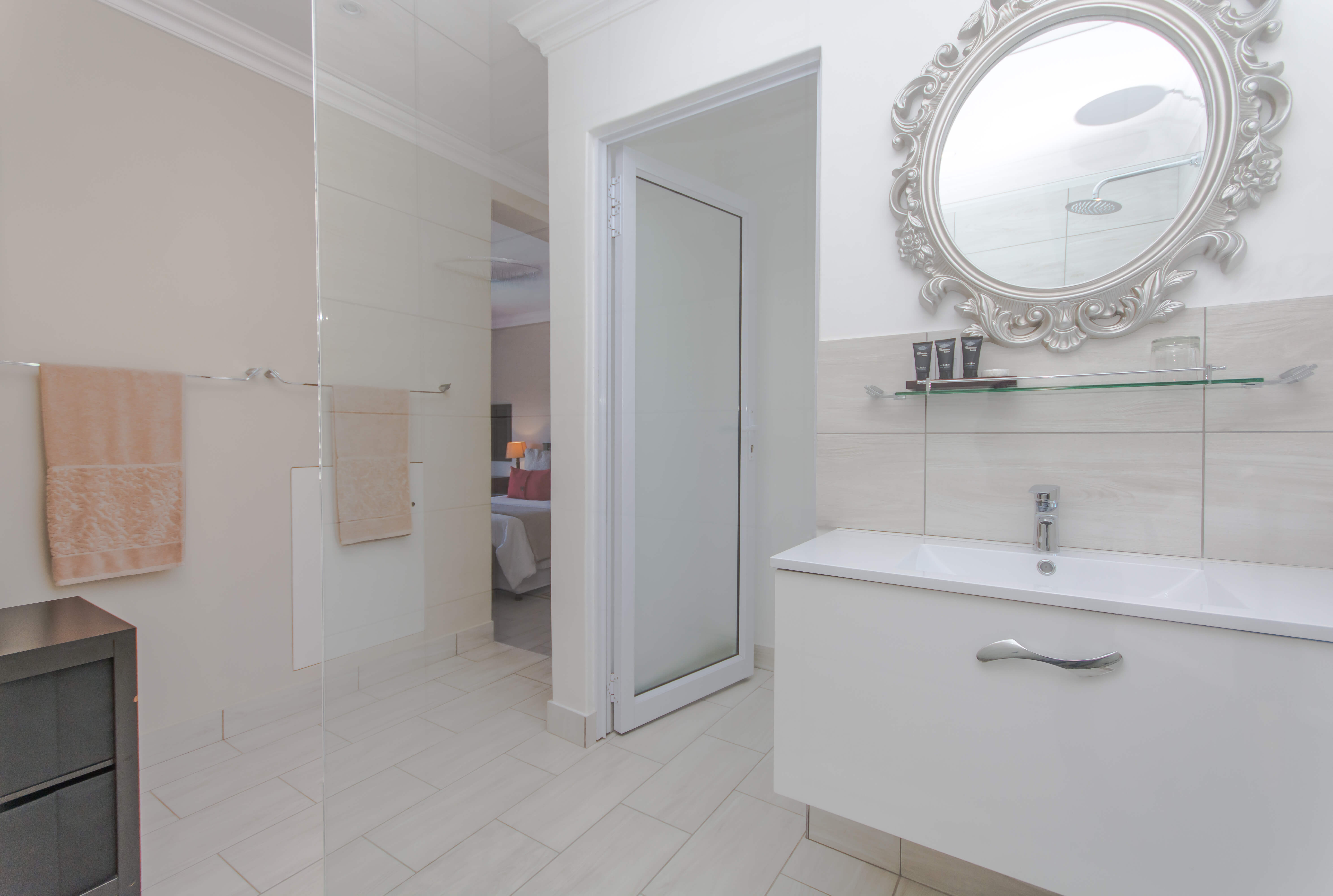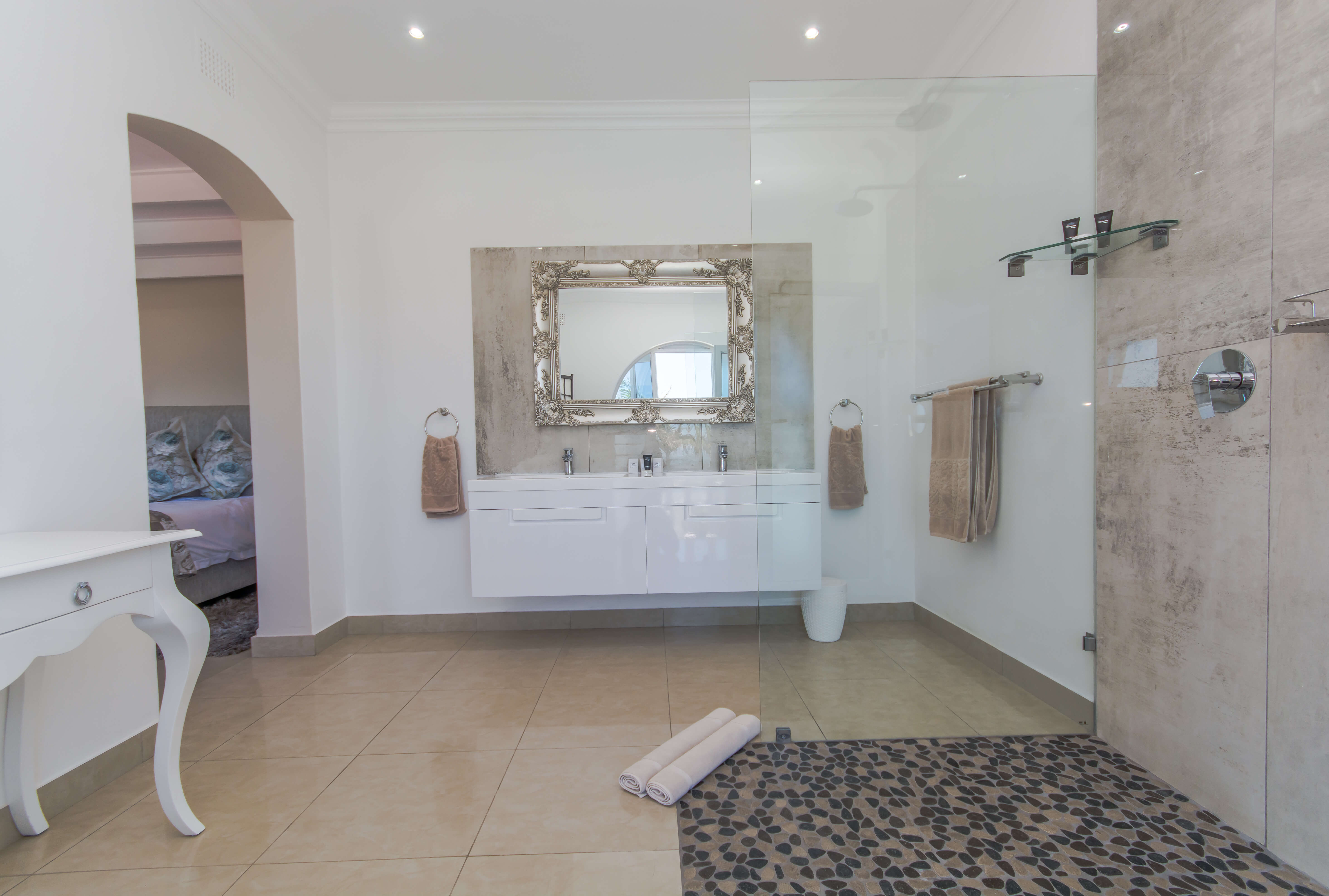 This bright and airy luxury room consists of a Queen size bed and features an en-suite bathroom with double basins, shower and bathtub.