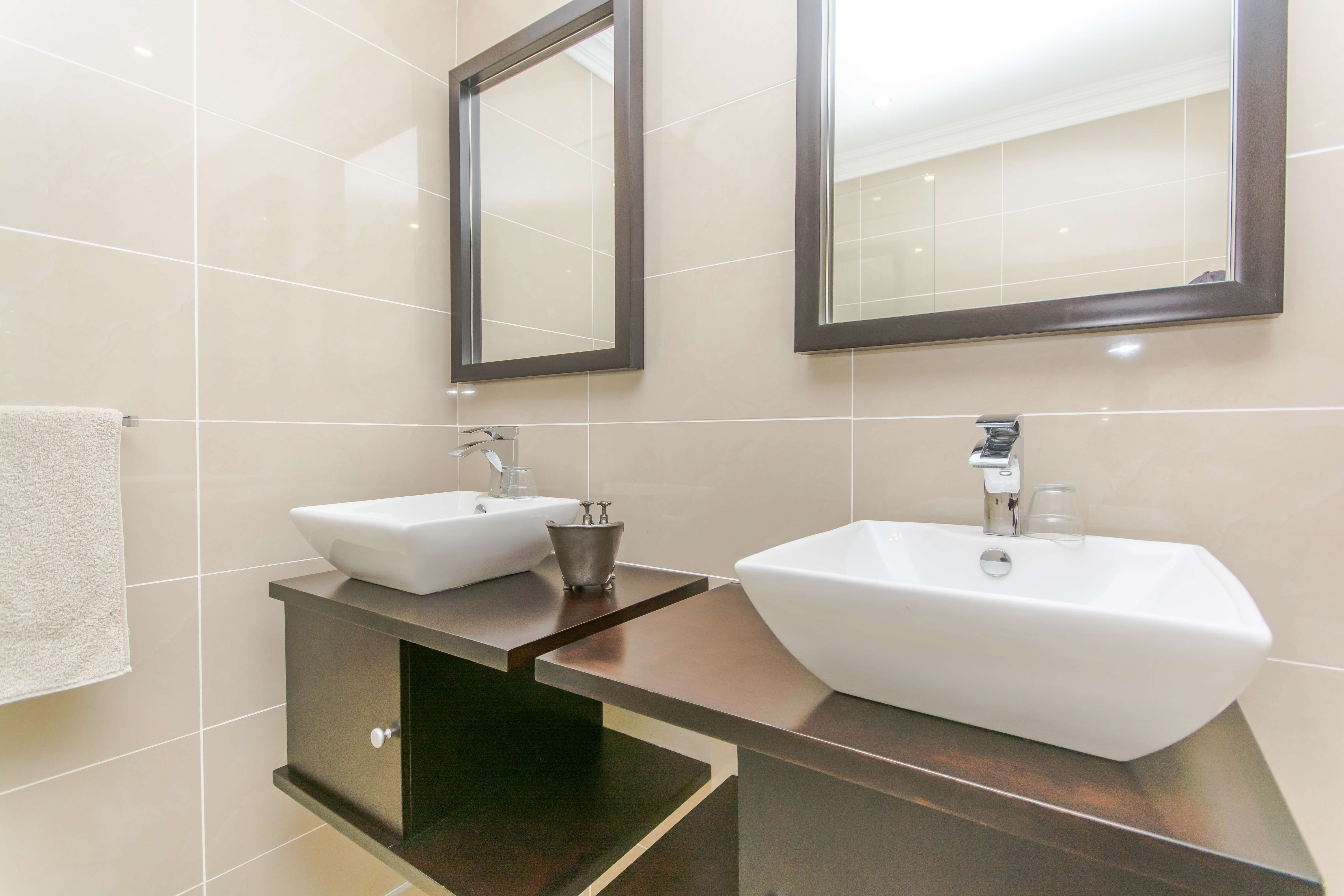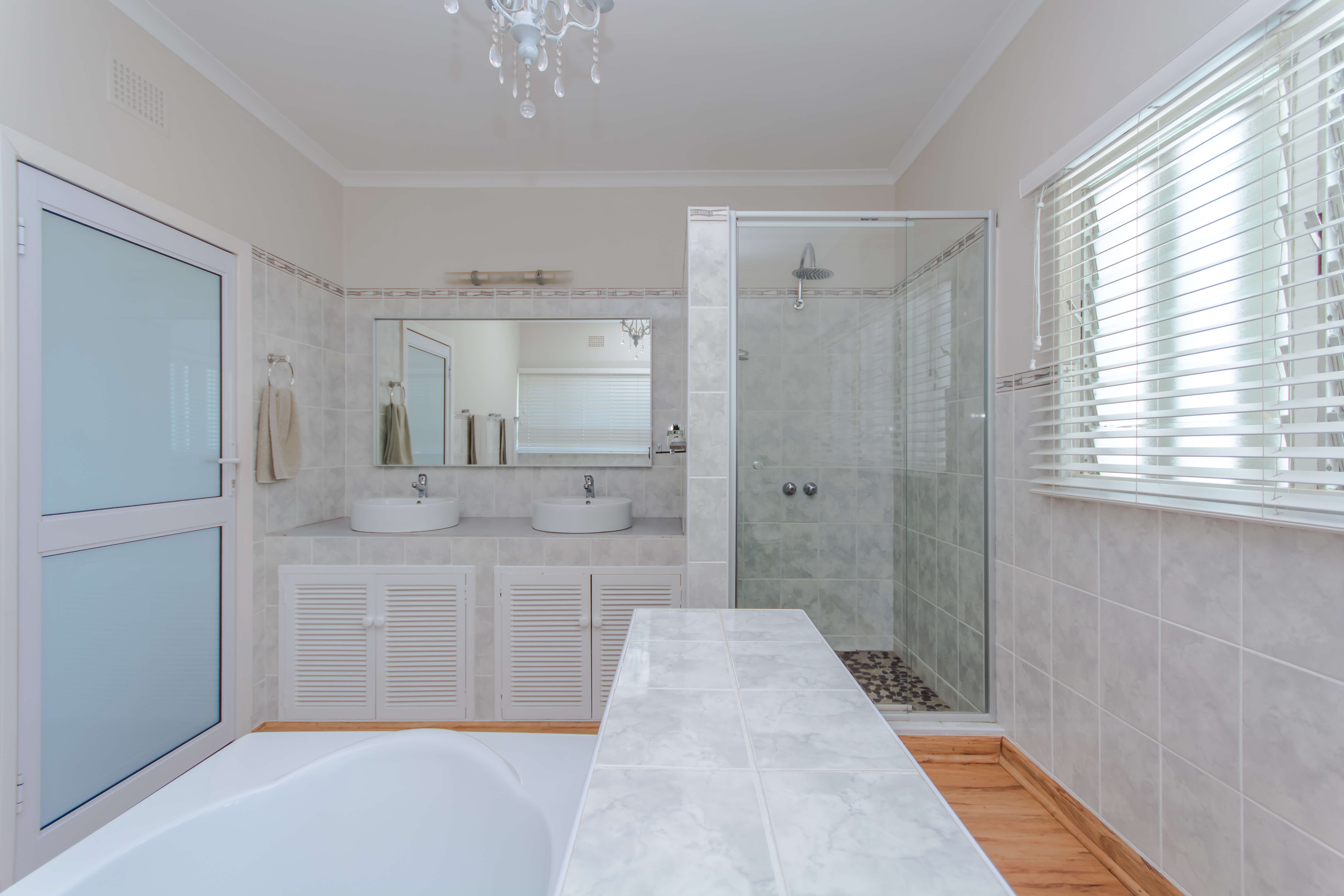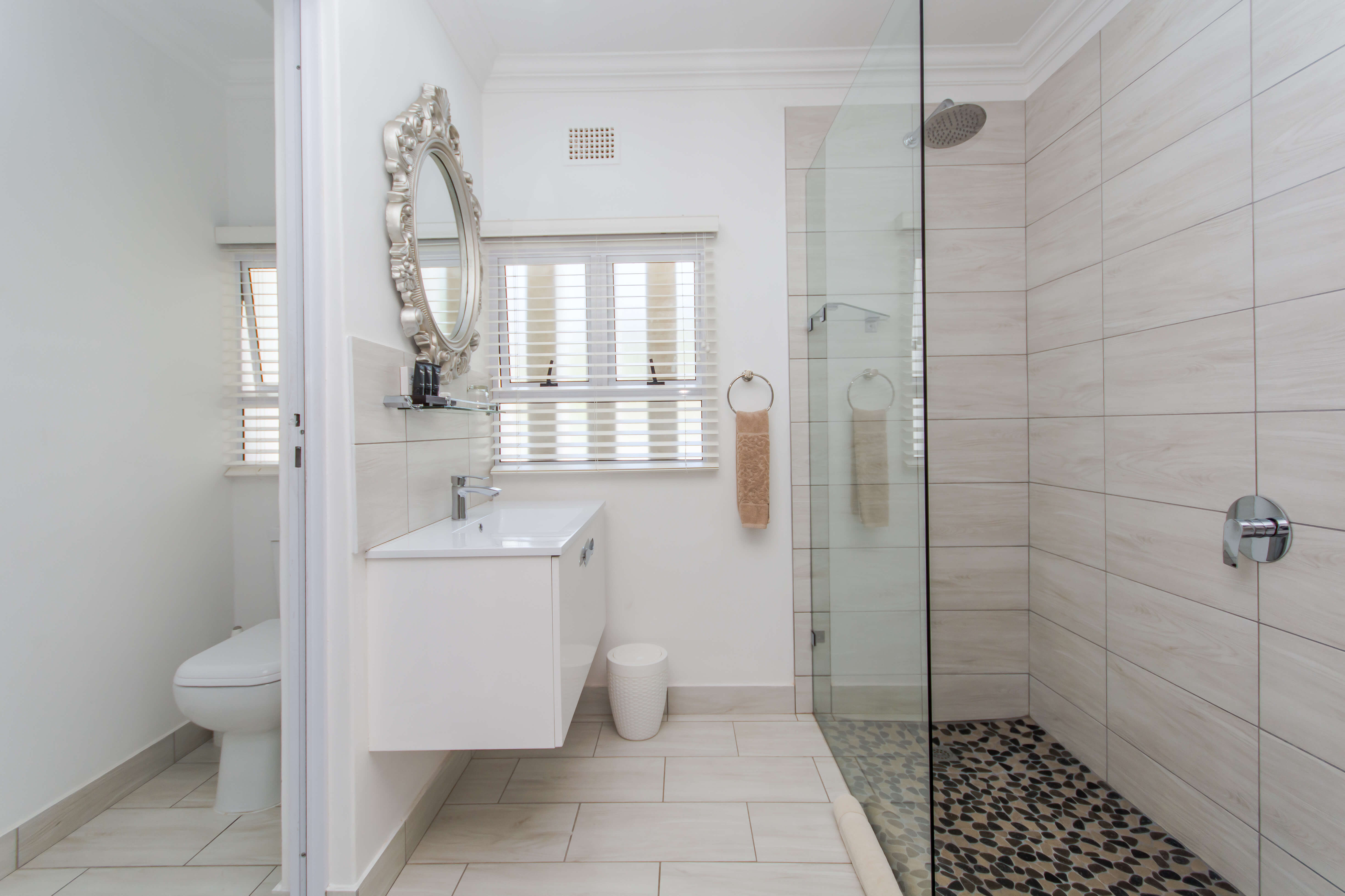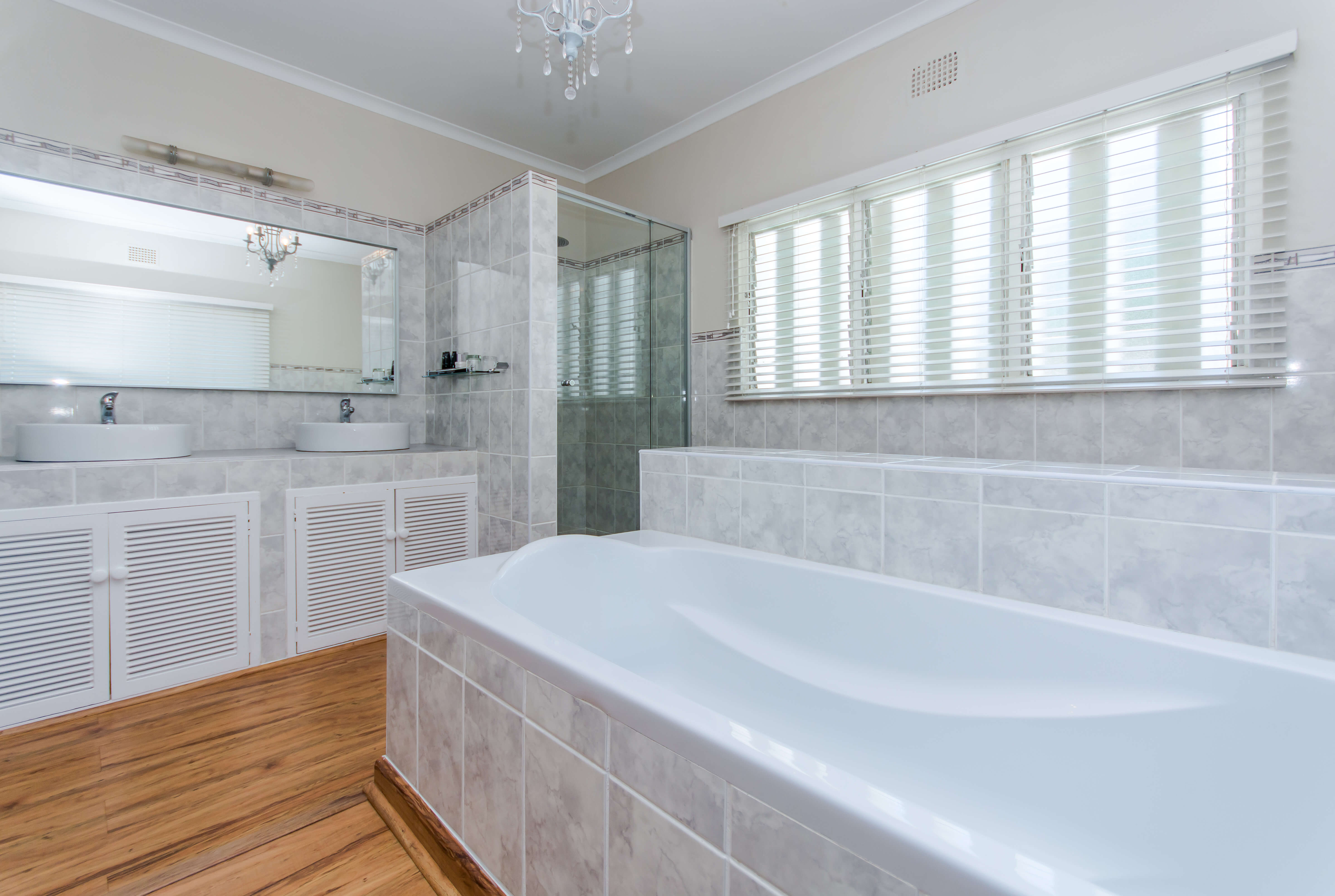 This bright and airy luxury room consists of a Queen size bed and features an en-suite bathroom with double basins, shower and bathtub.