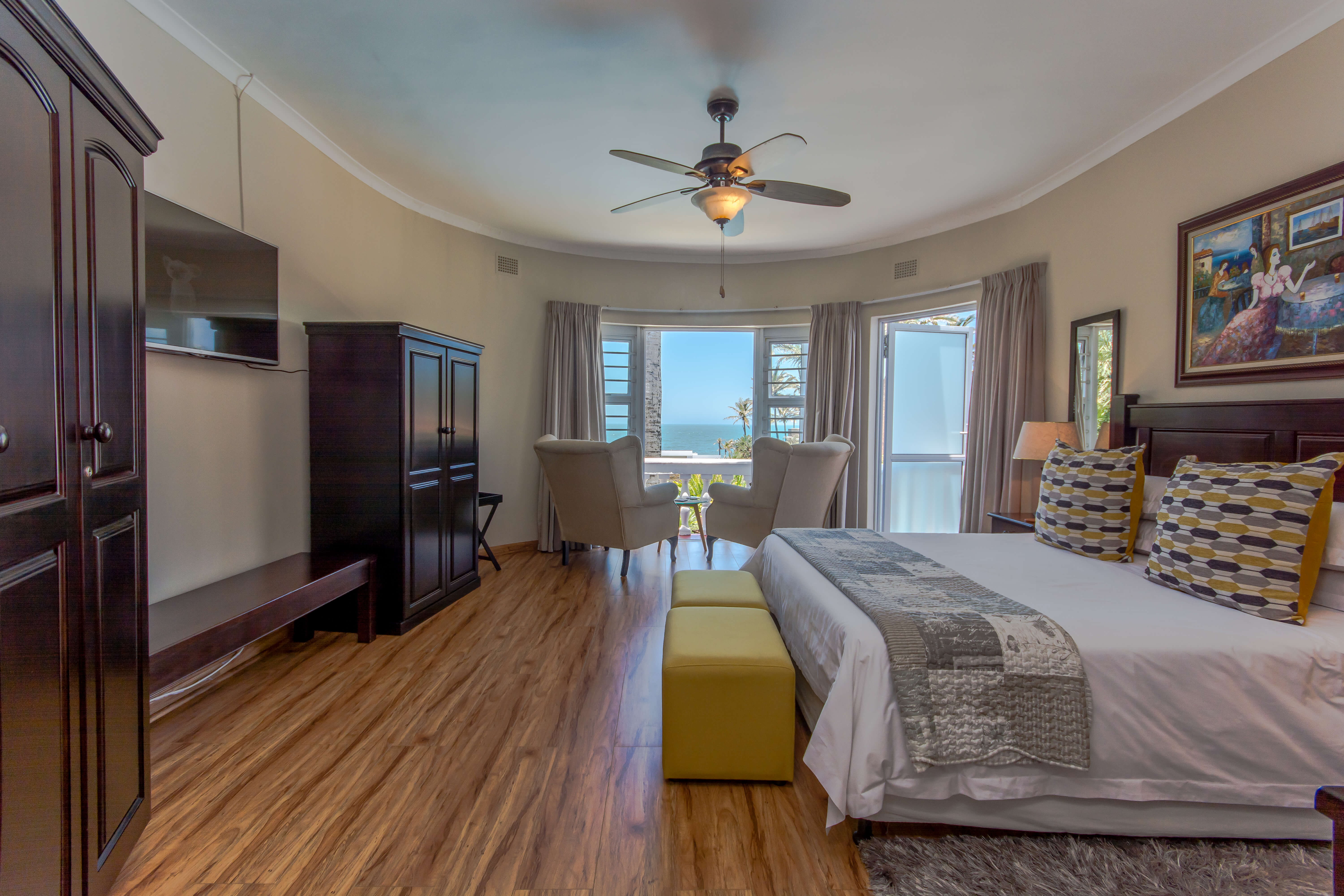 This spacious bright and airy Luxury Room with sea view, consist of queen size bed, en-suite bathroom with double basins, shower and bathtub.