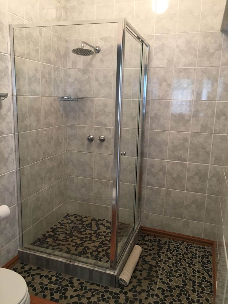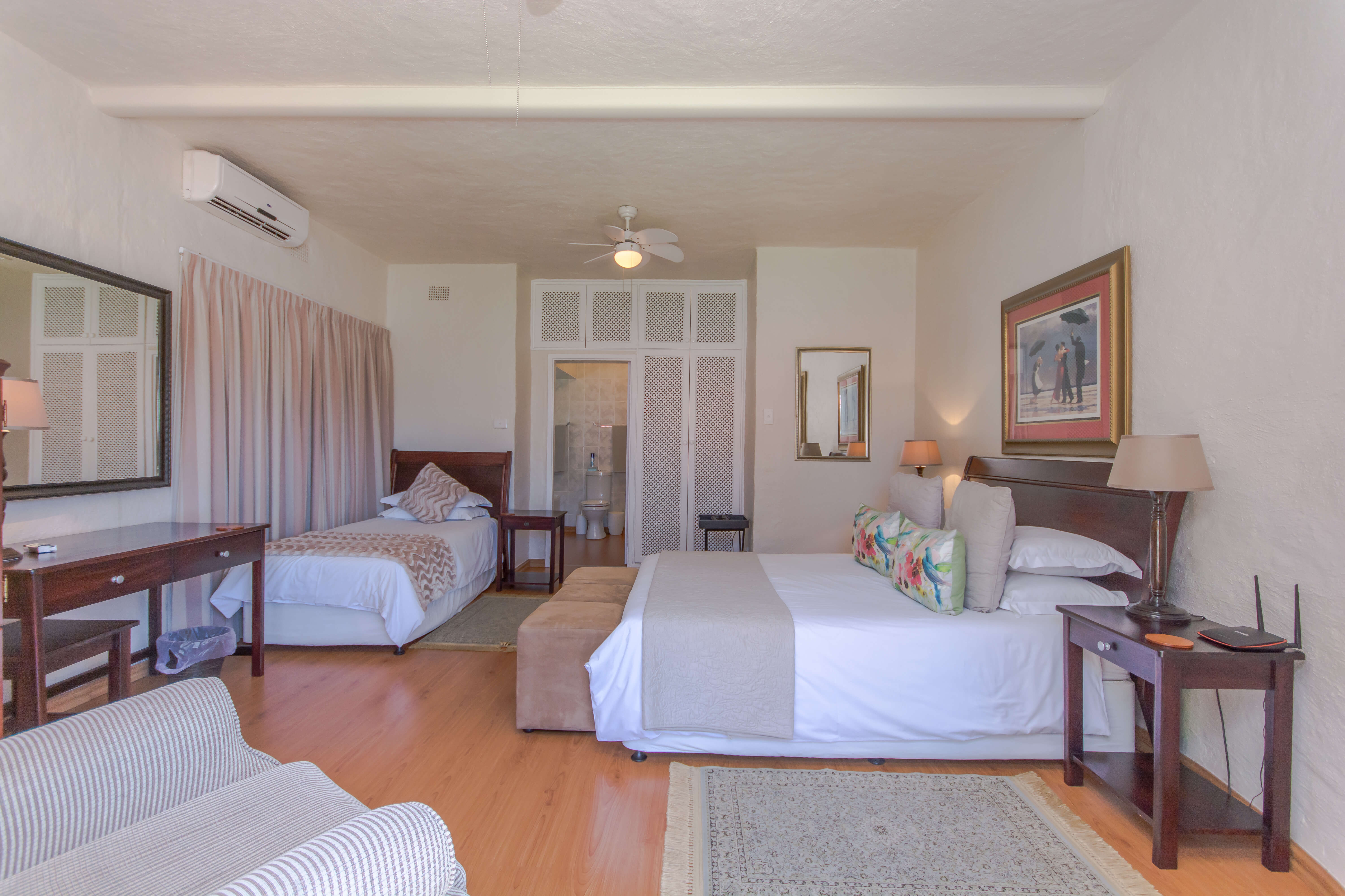Our cosy family room consists of a Queen size bed and one Single bed, as well as an en-suite bathroom with a shower and bathtub. This room is situated next to the braai area.